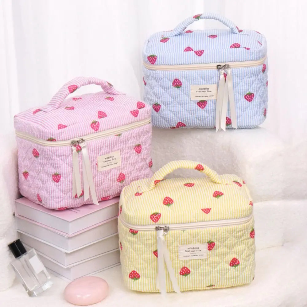 Sminkväskorna med jordgubbar gör sig lika bra på sminkbordet som i resväskan och är en perfekt present till någon som älskar unika och trendiga accessoarer.